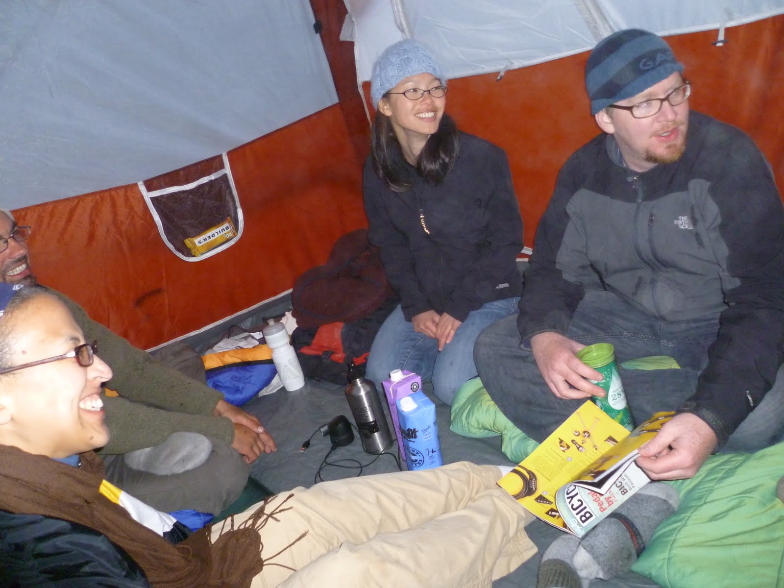 Now, the campsite was completely socked in by blustering fog. About 30 foot visibility and “rain” dripping down from the trees. We promptly put on every piece of clothing we brought and set out for shots of Patron with fancy cheeses. Around 7:00, a huge group of bike friends from the city appeared at our campsite with homemade bread, extra water, cocktails and cheer. Unfortunately, no warm clothes, so their stay was brief before they went back to town. We scarfed down big pasta dinners in the cold and damp. Finally outdone by the weather at dusk, we packed into the biggest tent for cards, chocolates and listening to the fireworks shows. To bed early.