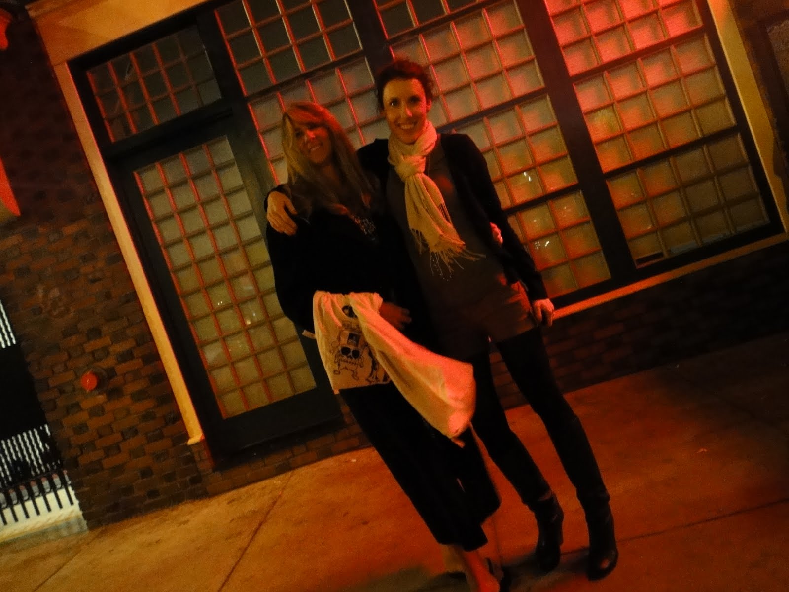 On Saturday night, I paired the shorts with tights, boots, a gray v-neck tee, black sweater and long necklace for a summer rock-concert look matched with my own style. Yvette wore striped arm-warmers, which was awesome.