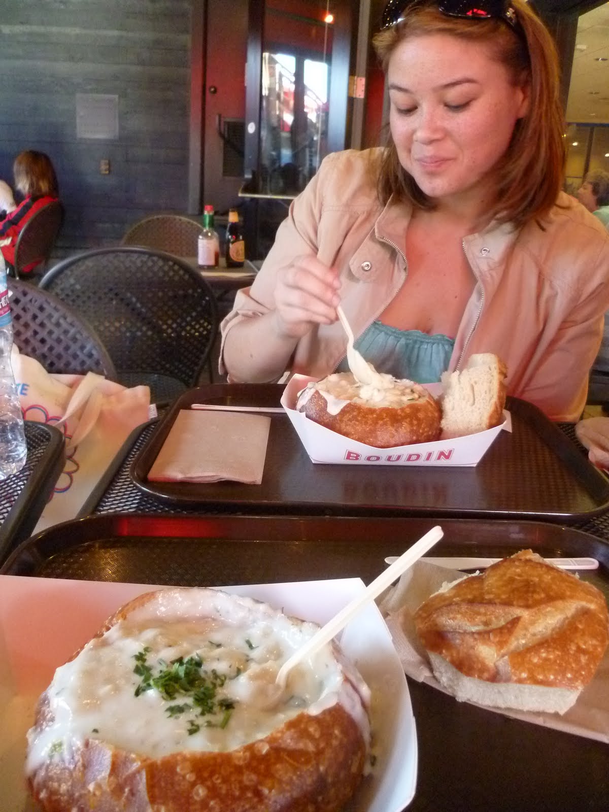 We completed our tourist visit to Pier 39 with classic clam chowder in sourdough bread bowls for an early dinner.