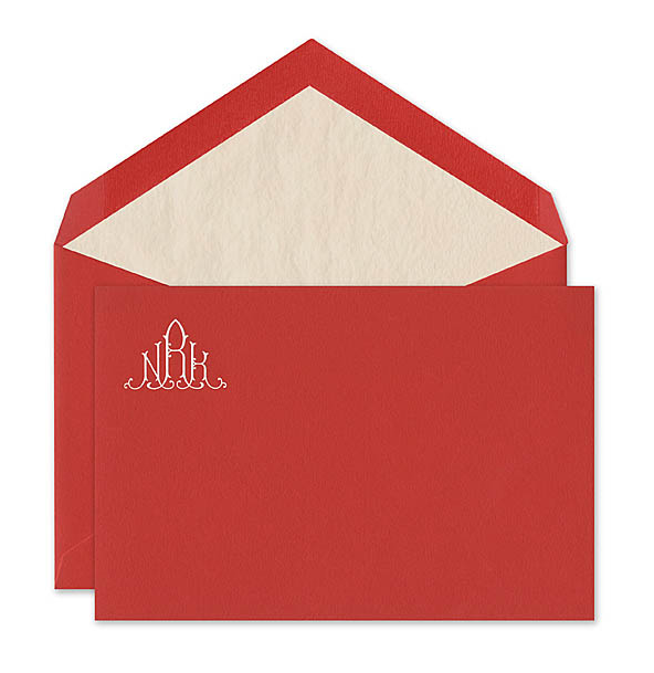 Light dove gray with a curly name engraved for spring and summer. Stunning red with a monogram and tissue liner new for fall and winter.