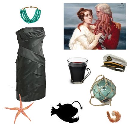Wear: A pleated dress that can easily pass for seaweed paired with a chunky turquoise necklace. And spooky, creature-of-the-sea hair and make-up. Davey Jones for him, complete with captain’s hat.