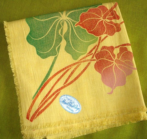 Hawaii offers up a lot of terrible souvenirs, but there are a few gems for careful shoppers. Macadamia nut chocolates are never a bad choice and there are some nice handmade items here and there. On Etsy, this hand printed tablecloth featuring Hawaiian flora is a great example.