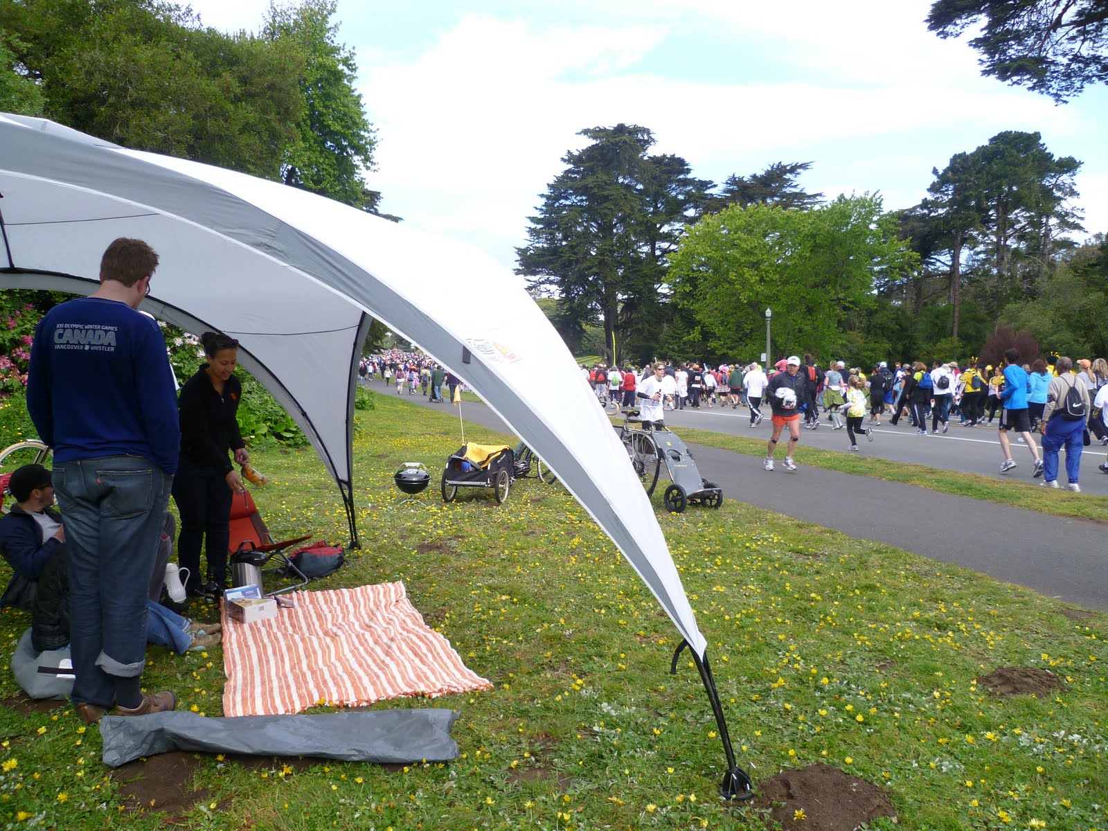 Up so early on Sunday! 6:45 wake up to get out of the house for Bay to Breakers. This year was the 100th anniversary race and an even bigger deal than usual. We loaded up five bikes with all kinds of picnic gear, despite the forecast for rain. Lots of detours along the way and a few drizzles. We made it over and set up camp – just to be told that we weren’t allowed to have a BBQ or a canopy. Drats.