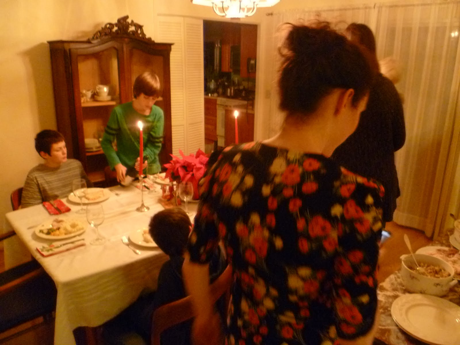Rob’s sister and her three healthiest kids arrived at 5:00. Rob teleconferenced in again to see them open their gifts and we sat down to a festive holiday meal:
