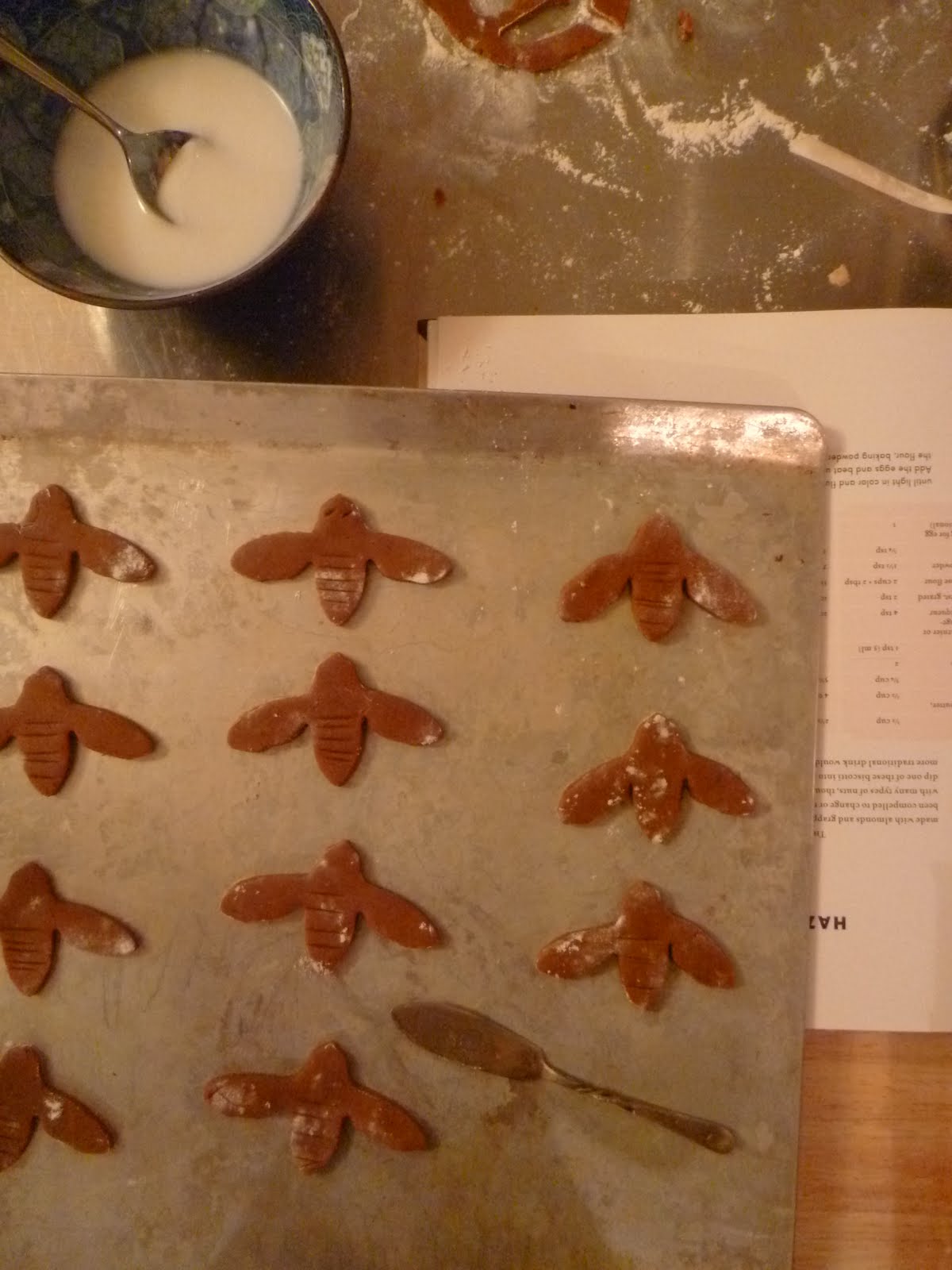 Late start the next morning. Very lazy, we watched Street Thief on Netflix and ate pancakes. At 12:30, Rob and I took the car out to get Christmas card supplies and ran smack into terrible SantaCon traffic. It took forever! Back at the house, I made a big batch of glazed “ginger bees” based on the Tartine gingerbread recipe and wrote cards.