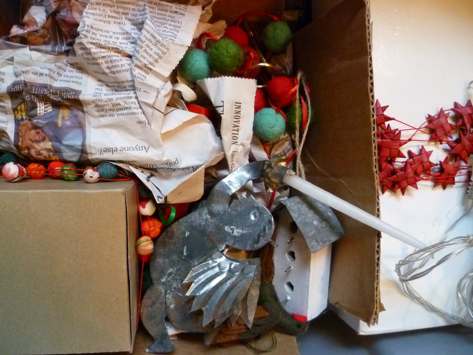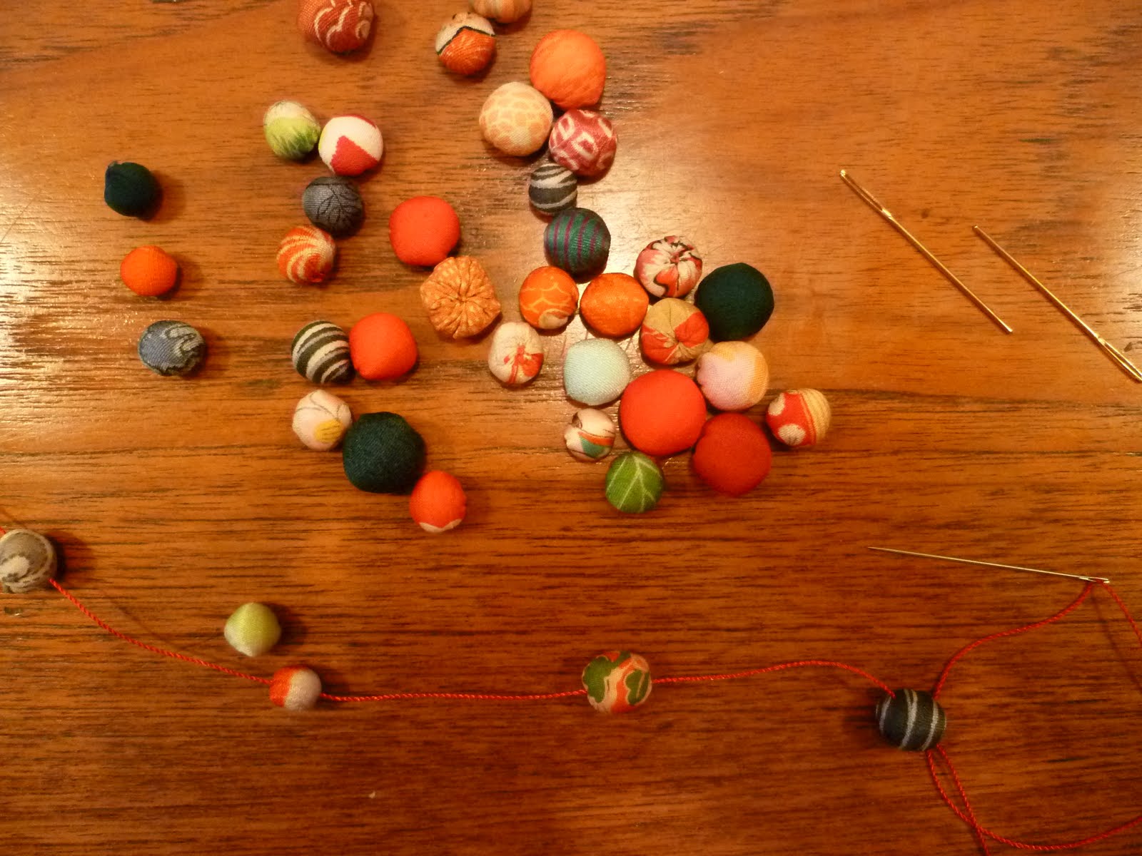 I wrote our holiday journal for the year and also made the quilted fabric balls purchased at a shrine sale in Japan into a garland for the tree: